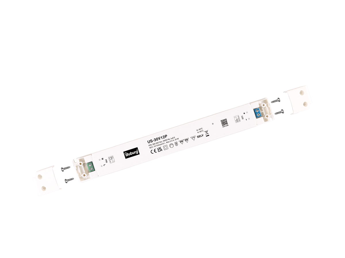 LED power supply US-30V12P: LED transformer constant voltage, input 220 – 240 V (AC), output 12 V (DC), non-dimmable, independent installation.