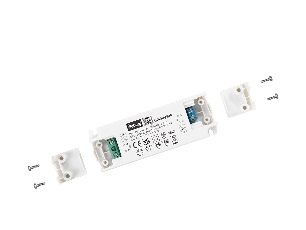 LED power supply UF-20V24: LED transformer constant voltage, input 220 – 240 V (AC), output 24 V (DC), non-dimmable, independent installation.