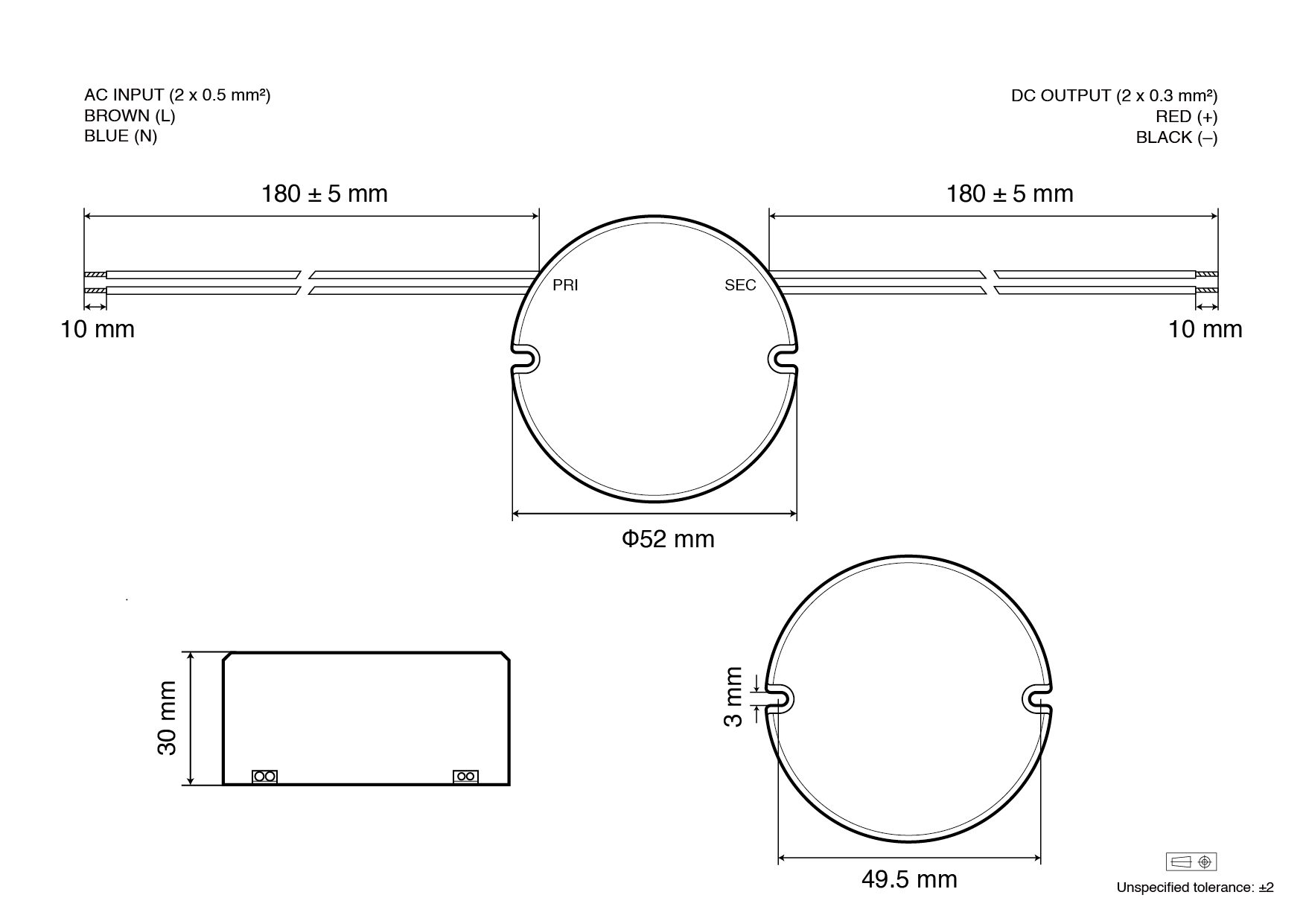 Cable length, output side180 ± 5 mm