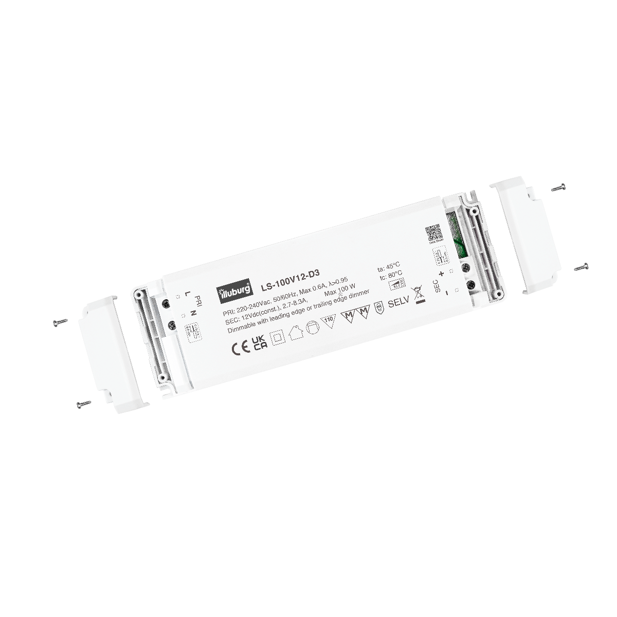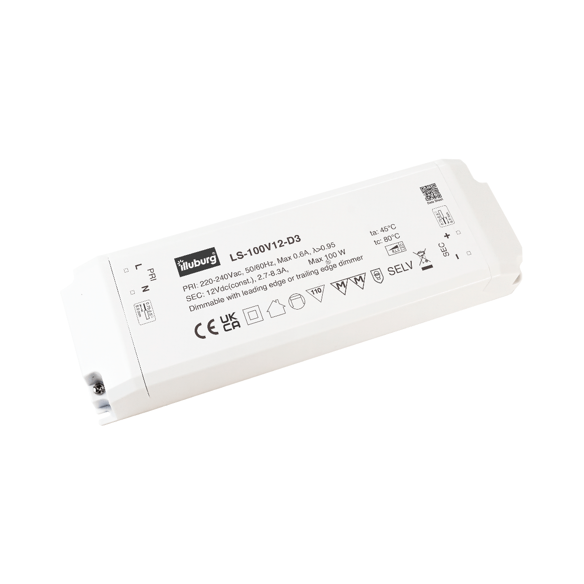 LED-TREIBER LS-100V12-D3: Eingang 220 – 240 V (AC), Ausgang 12 V (DC) Konstantpannung, dimmbar, unabhängige Installation, Anschluss durch Schraubklemmen.