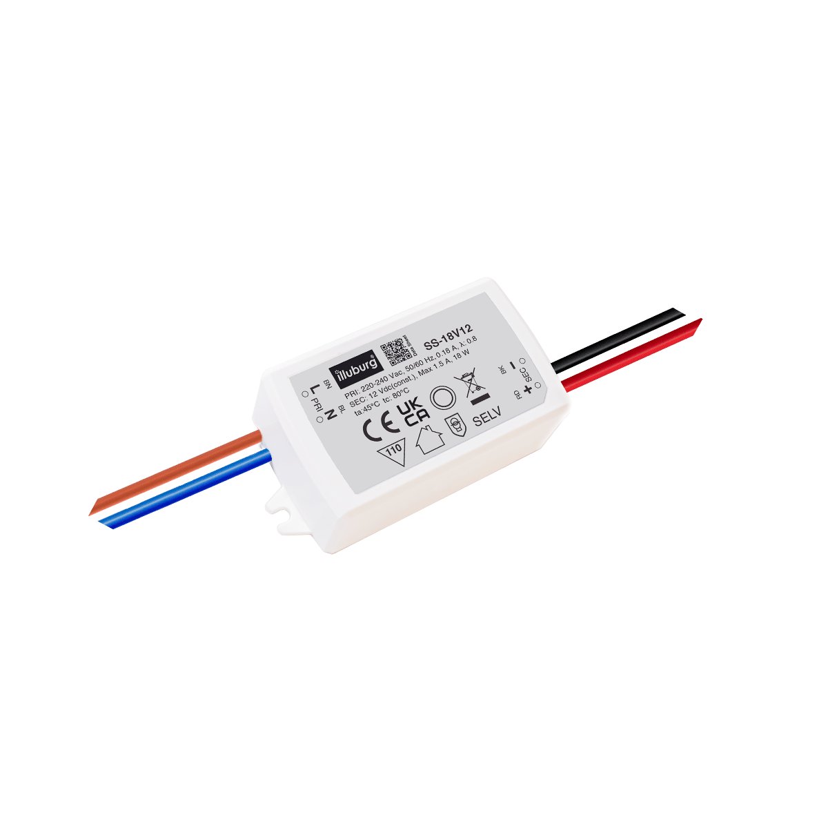 LED-TREIBER SS-18V12: Eingang 220 – 240 V (AC), Ausgang 12 V (DC) Konstantpannung, nicht dimmbar, Einbau-Installation.