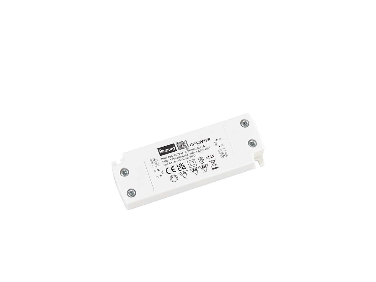 LED-Netzteil UF-20V12P: LED Trafo Konstantpannung, Eingang 220 – 240 V (AC), Ausgang 12 V (DC), nicht dimmbar, flackerfrei, unabhängige Installation.