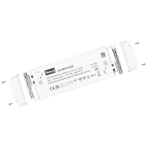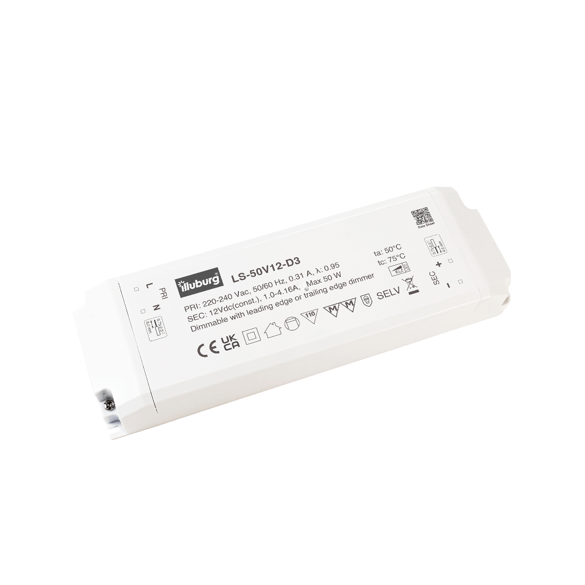 LED-TREIBER LS-50V12-D3: Eingang 220 – 240 V (AC), Ausgang 12 V (DC) Konstantpannung, dimmbar, unabhängige Installation, Anschluss durch Schraubklemmen.