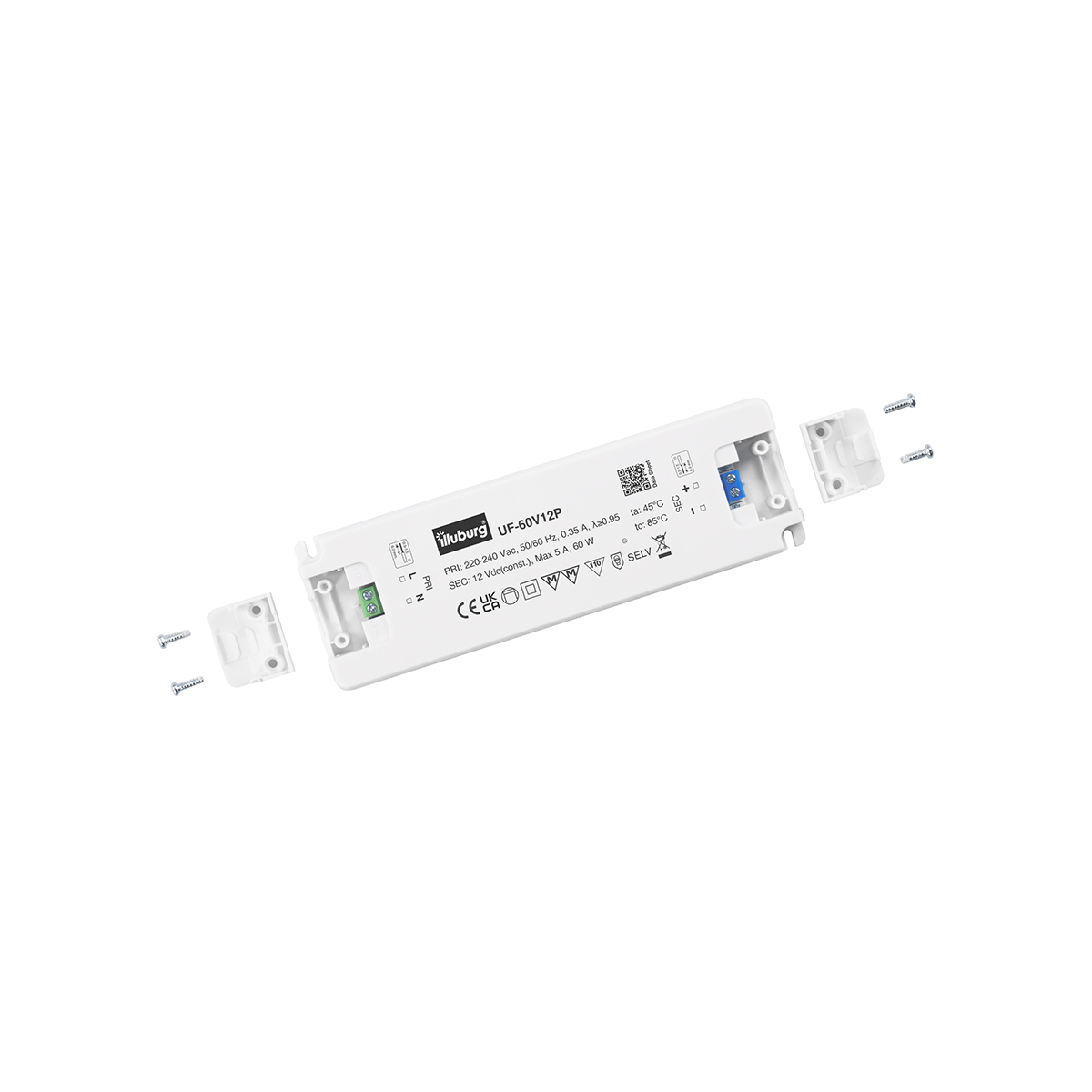 LED-TREIBER UF-60V12: Eingang 220 – 240 V (AC), Ausgang 12 V (DC) Konstantpannung, nicht dimmbar, unabhängige Installation, Anschluss durch Schraubklemmen.