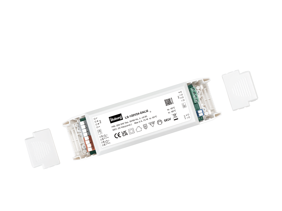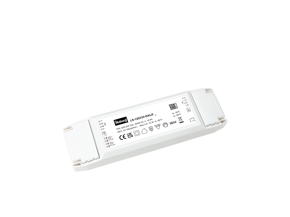 LED-Netzteil LS-120V24 DALI2: LED Trafo Konstantpannung, Eingang 220 – 240 V (AC), Ausgang 24 V (DC), dimmbar, flackerfrei, unabhängige Installation.