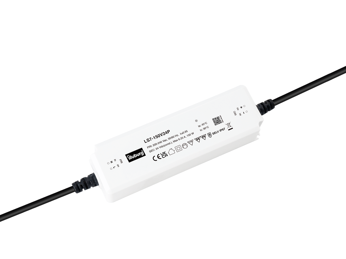 LED-Netzteil LS7-150V24P: LED Trafo Konstantpannung, Eingang 100 – 277 V (AC) / 125 – 420 V (DC), Ausgang 24 V (DC), nicht dimmbar, Einbau-Installation.