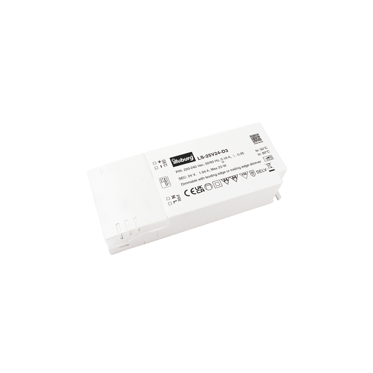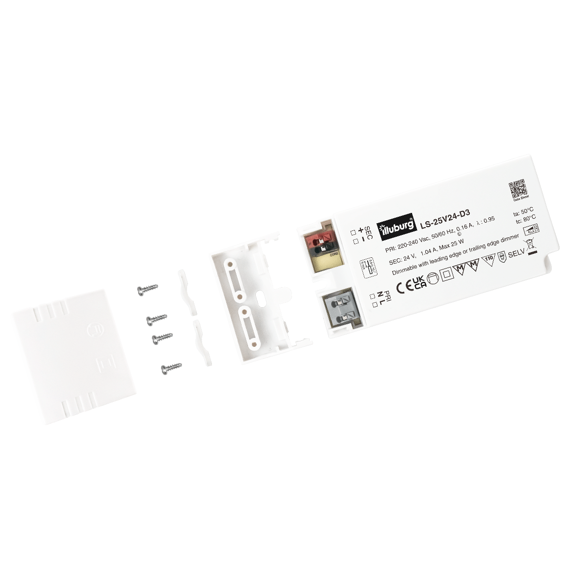 LED-TREIBER LS-25V24-D3: Eingang 220 – 240 V (AC), Ausgang 24 V (DC) Konstantpannung, dimmbar, unabhängige Installation, Anschluss durch Schraubklemmen.