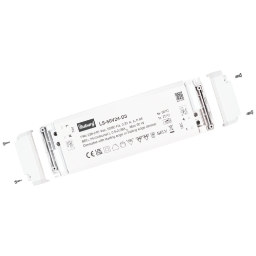 LED-TREIBER LS-50V24-D3: Eingang 220 – 240 V (AC), Ausgang 24 V (DC) Konstantpannung, dimmbar, unabhängige Installation, Anschluss durch Schraubklemmen.