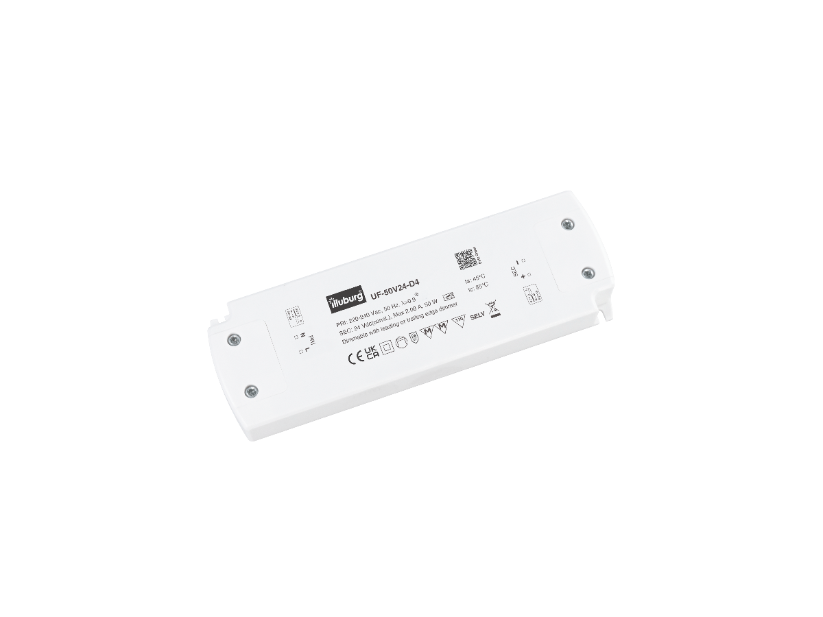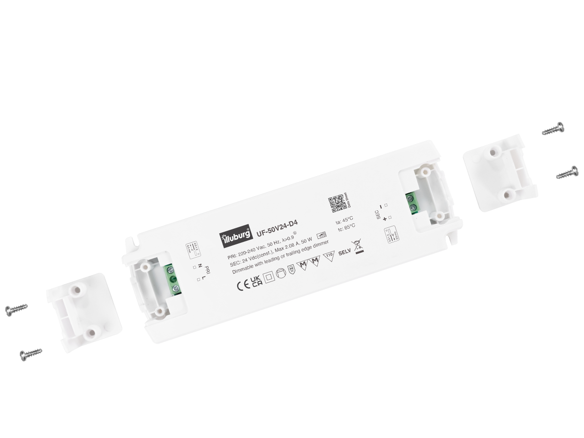 LED-TREIBER UF-50V24-D4: Eingang 220 – 240 V (AC), Ausgang 24 V (DC) Konstantpannung, dimmbar, unabhängige Installation, Anschluss durch Schraubklemmen.