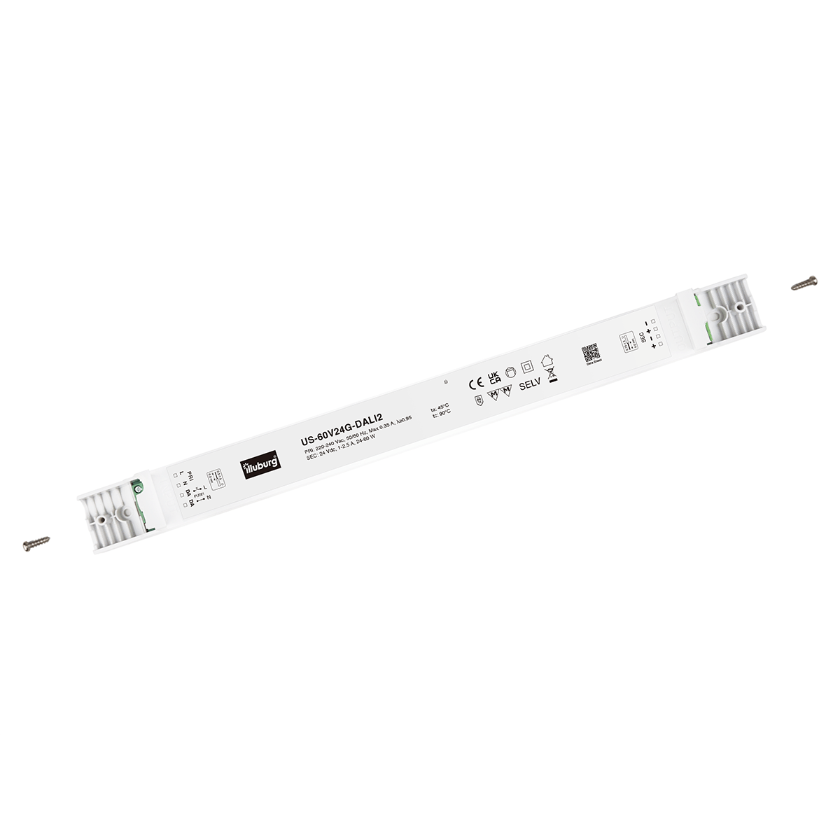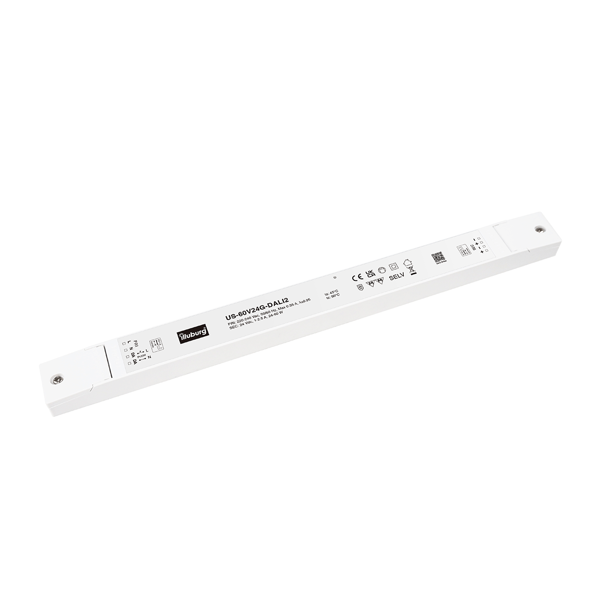 LED-Netzteil US-60V24-DALI2: LED Trafo Konstantpannung, Eingang 220 – 240 V (AC), Ausgang 24 V (DC), dimmbar mit DALI2, PUSH(pri.), flackerfrei, unabhängige Installation.