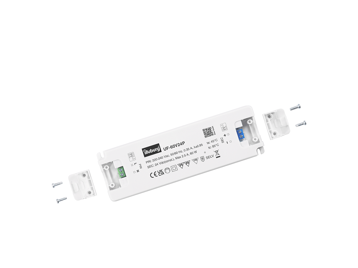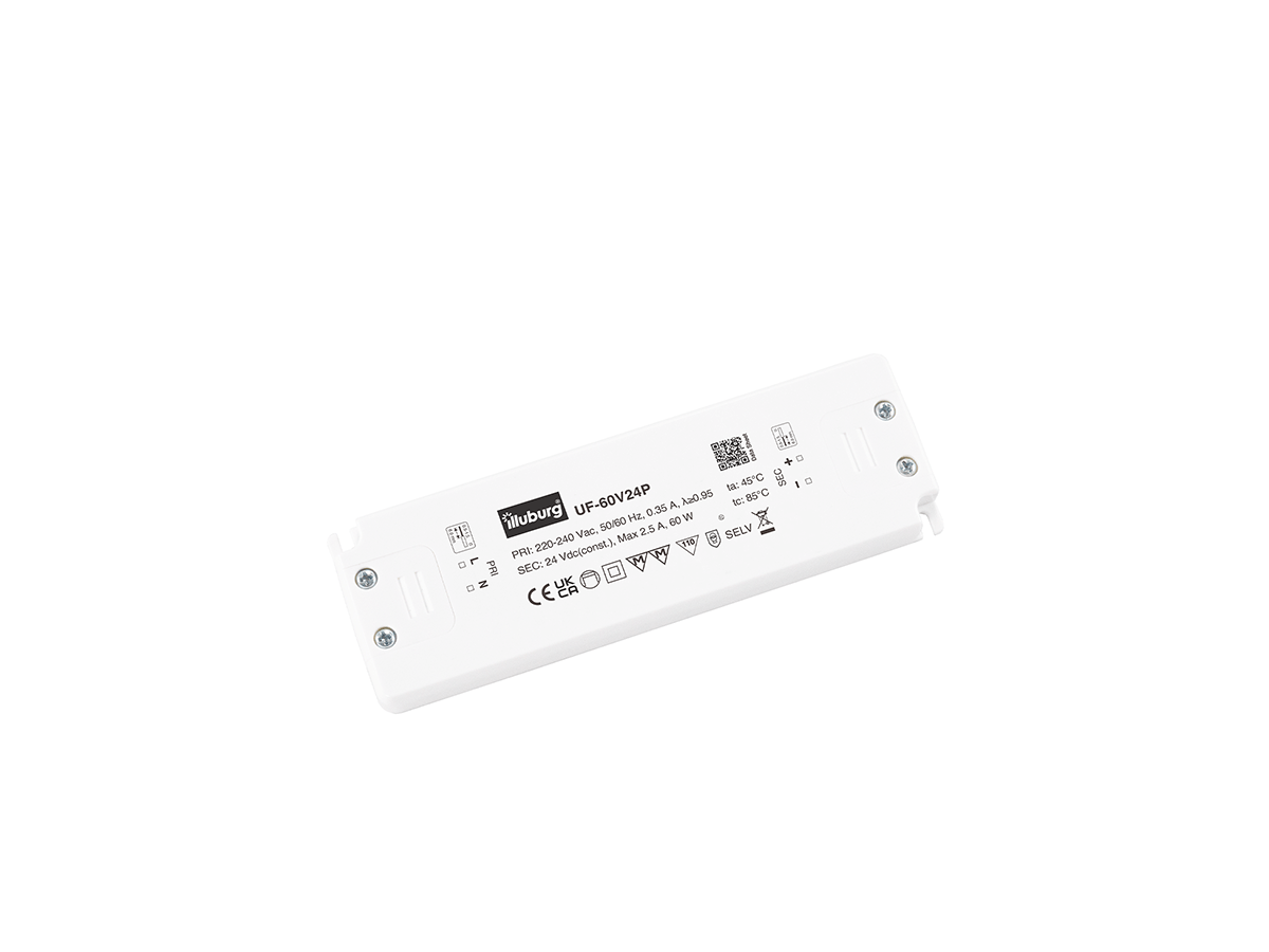 LED-Netzteil UF-60V24: LED Trafo Konstantpannung, Eingang 220 – 240 V (AC), Ausgang 24 V (DC), nicht dimmbar, flackerfrei, unabhängige Installation.
