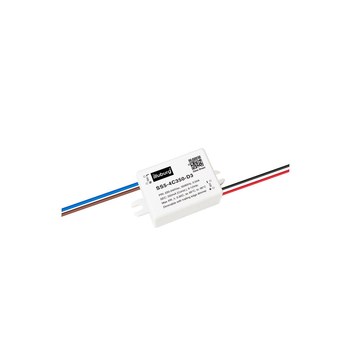 LED-TREIBER SS5-4C350-D3: Eingang 220 – 240 V (AC), Ausgang 350mA Konstantstrom mit Spannungsbereich 6 – 12 V (DC), dimmbar, Einbau-Installation.