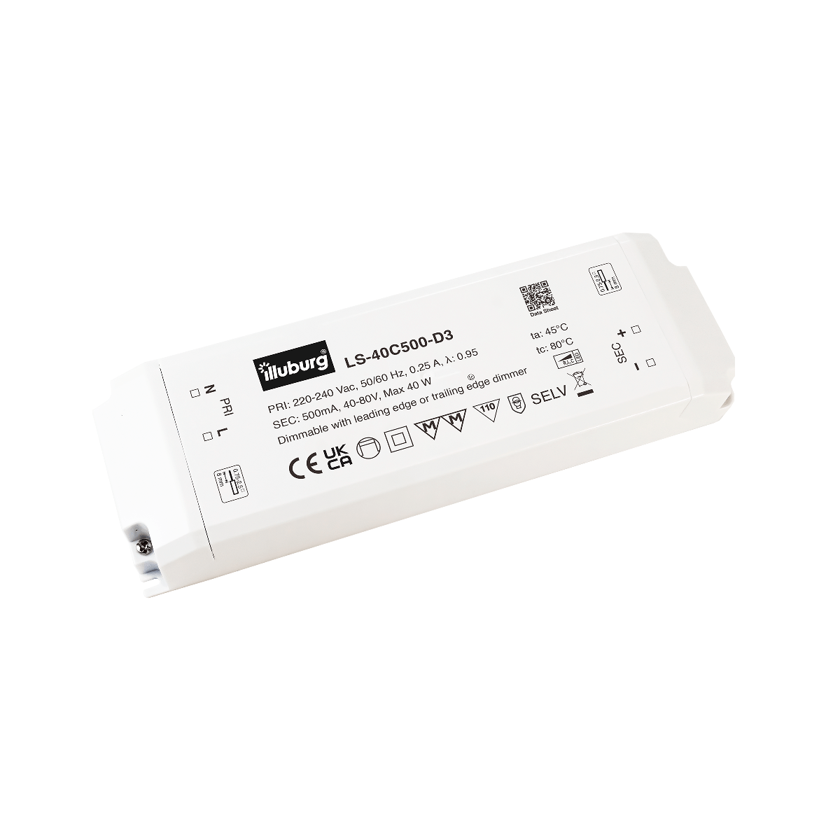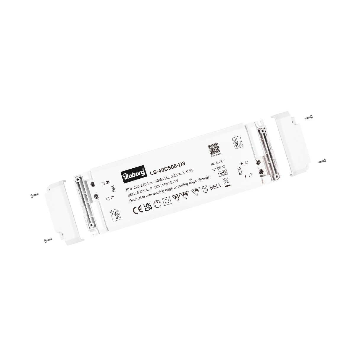 LED-TREIBER LS-40C500-D3: Eingang 220 – 240 V (AC), Ausgang 500mA Konstantstrom mit Spannungsbereich 40 – 80 V (DC), dimmbar, unabhängige Installation, Anschluss durch Schraubklemmen.